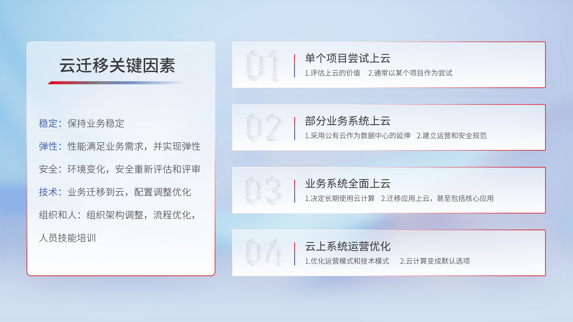 结合实际业务,,从规划设计、、、、云平台选型、、、、云原生改造、、数据迁移、、集成交付,,,迁移全过程为客户识别最佳上云路径,,做好风险识别管理,,,,设计网络架构、、、身份权限、、、安全审计合规、、操作审计、、日志审计、、、监控告警策略、、多站点容灾设计等,,对云上基础设施进行整体规划,,,,提升IT治理水平,,,,以满足弹性、、、、高可用、、高性能的需求。。