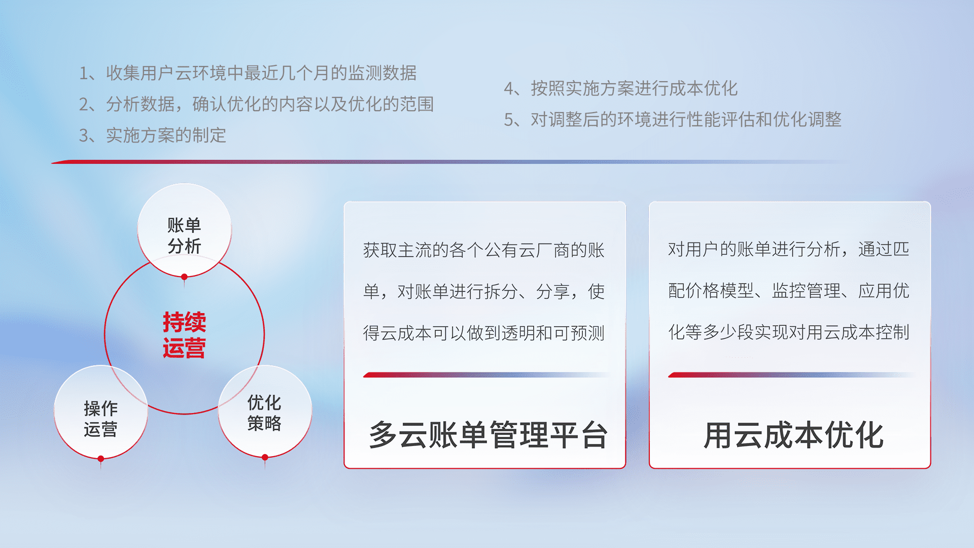 通过多云纳管,,,以统一的资源数据模型把客户的云资源进行抽象和封装,,,进而实现对多云资源的统一操作,,,保障云资源管理的可靠性、、、稳定性与可用性。。。。量身定制化运维内容,,,配置、、、、开发运维、、、补丁管理、、、备份、、、、监控、、认证和访问管理、、、、审计和日常巡检等,,,,保障在用云过程中的可靠度,,,稳定度以及高可用率。。